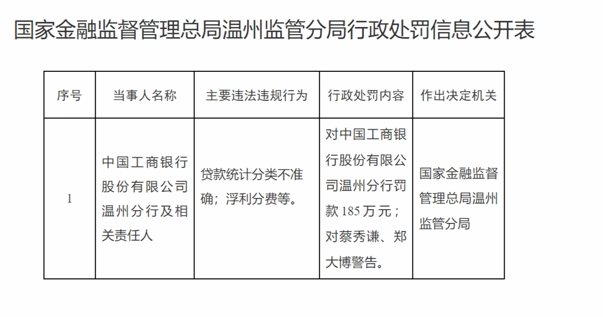 1月23日,国家金融监督管理总局温州监管分局行政处罚信息公开表显示,中国工商银行股份有限公司温州分行,贷款统计分类不准确;浮利分费等,被罚款185万元;责任人蔡秀谦、郑大博被警告。